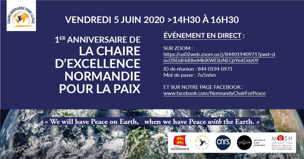 La Chaire d’excellence Normandie pour la Paix est un dispositif imaginé par la Région Normandie et le CNRS. Elle a pour vocation de fédérer des chercheurs internationaux afin de promouvoir un idéal de paix avec la Terre et de porter plus en avant le droit des générations futures. Elle est soutenue par la Région Normandie, le CNRS et portée par la MRSH CNRS de l’Université de Caen Normandie. Le vendredi 5 juin 2020, avec des intervenants de plusieurs continents, la Chaire présentait pour son premier anniversaire un panorama des actions menées en France, en plusieurs régions du monde et à l’occasion de plusieurs grands événements internationaux.