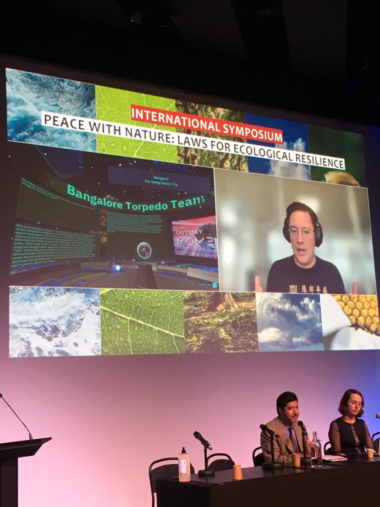 Ensuite, un panel international s’est exprimé sur les good stories et l’harmonisation du droit avec les systèmes naturels de la Terre. Durwood Zaelke a insisté sur la nécessité de s’unir pour préserver l’Ozone Stratosphérique (IGSD) et l’importance du rôle de la science dans sa protection. Andrew David Raine du programme des Nations Unies pour l’environnement s’est ensuite concentré sur la présentation des points clés du programme de droit de l’environnement de Montevidéo et son lien avec les good stories. Enfin, Sasha Koo-Oshima de l’Organisation des Nations unies pour l’alimentation et l’agriculture a relié le rôle de l’eau dans la production alimentaire, la santé animale, humaine et environnementale et présenté l’action de la FAO.