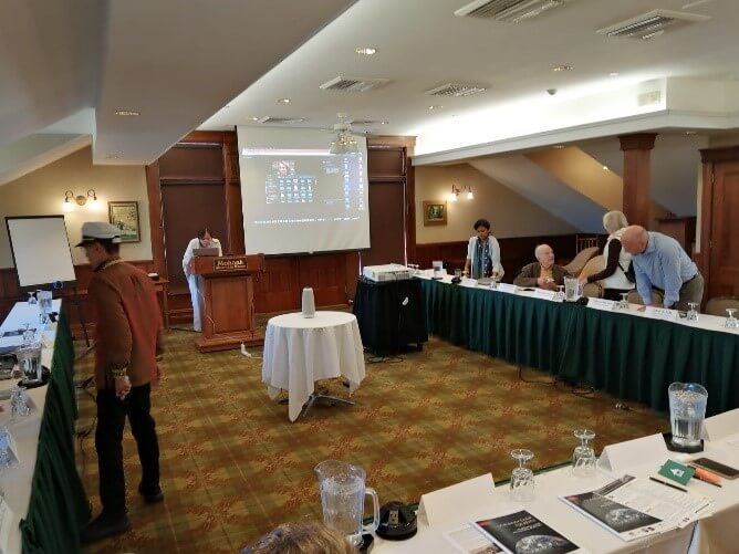 La session du matin a été consacrée à l’objectif et au symbolisme de l’événement, qui s’est déroulé au Mohonk Mountain House (Mohonk Consultations), historiquement connu pour ses conférences de paix, qui ont joué un rôle important dans la création de la Cour permanente d’arbitrage, également connue sous le nom de Tribunal de La Haye. Les participants ont également réfléchi aux actions de transformation pour l’harmonie avec la nature et à l’importance d’introduire la sagesse indigène dans ce processus pour changer la façon de penser en droit. En outre, il a été souligné le changement de paradigmes avec la création de la Chaire normande pour la paix, qui représente une étape importante dans l’histoire de la Normandie, auparavant associée à l’histoire de la guerre, mais qui, avec la création de la NCP, s’oriente vers l’élaboration d’une histoire de paix, entre les générations et pour la planète, incarnée par la devise « Nous aurons la paix sur Terre lorsque nous aurons la paix avec la Terre ». La session a été suivie par des membres du Centre Lenape, Joe Baker et Hadrien Coumans, qui ont honoré les participants par une prière et un chant sacré en respect de la terre ancestrale Lenape, Lenapehoking.