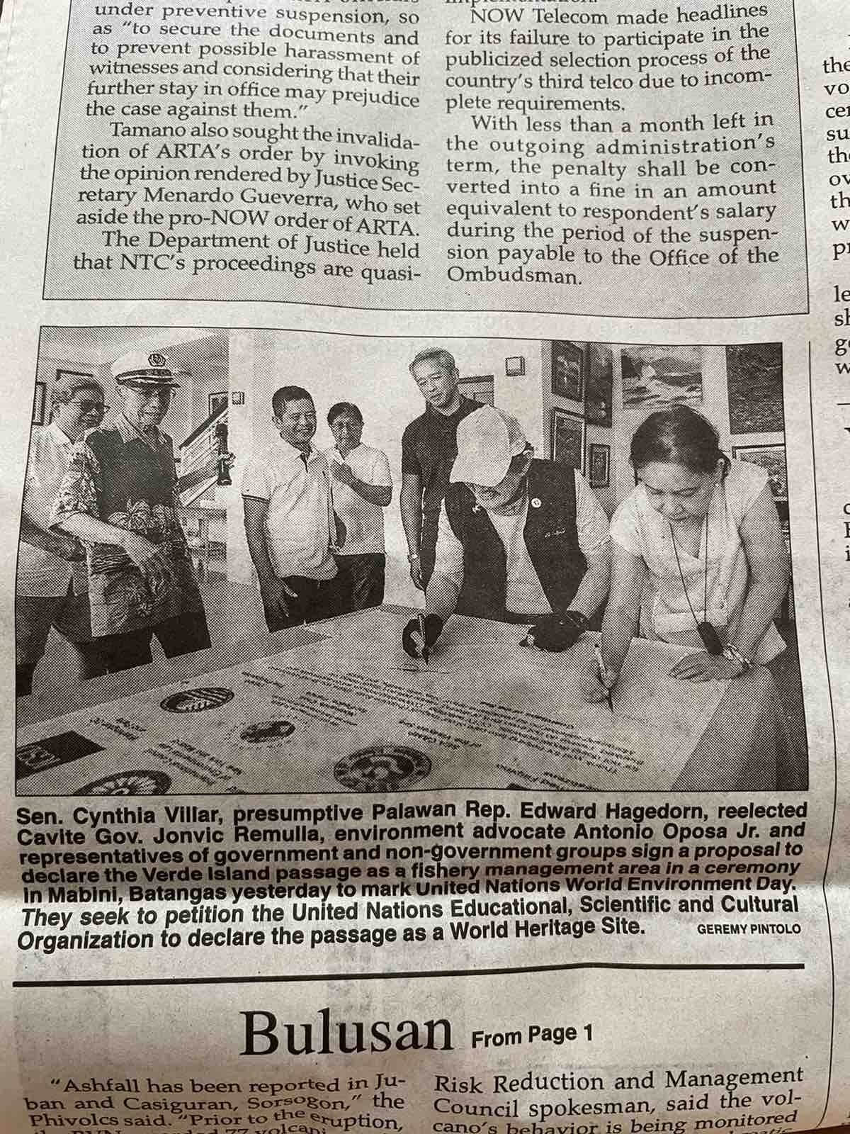 La sénatrice Cynthia Villar, le membre du Congrès Edward Hagedorn, le gouverneur de Cavite Jonvic Remulla, le défenseur de l’environnement Antonio Oposa Jr. et des représentants de groupes gouvernementaux et non gouvernementaux ont signé une proposition visant à déclarer le passage de l’île Verde comme zone de gestion de la pêche. La cérémonie s’est déroulée en toute simplicité à Anilao, Mabini, dans la province de Batangas, le 5 juin 2022, également Journée mondiale de l’environnement des Nations unies. Ils cherchent à demander à l’Organisation des Nations unies pour l’éducation, la science et la culture (UNESCO) de déclarer le passage comme un site du patrimoine mondial.