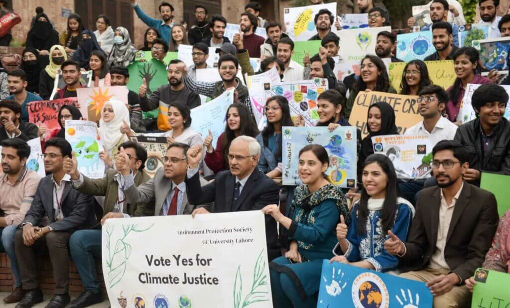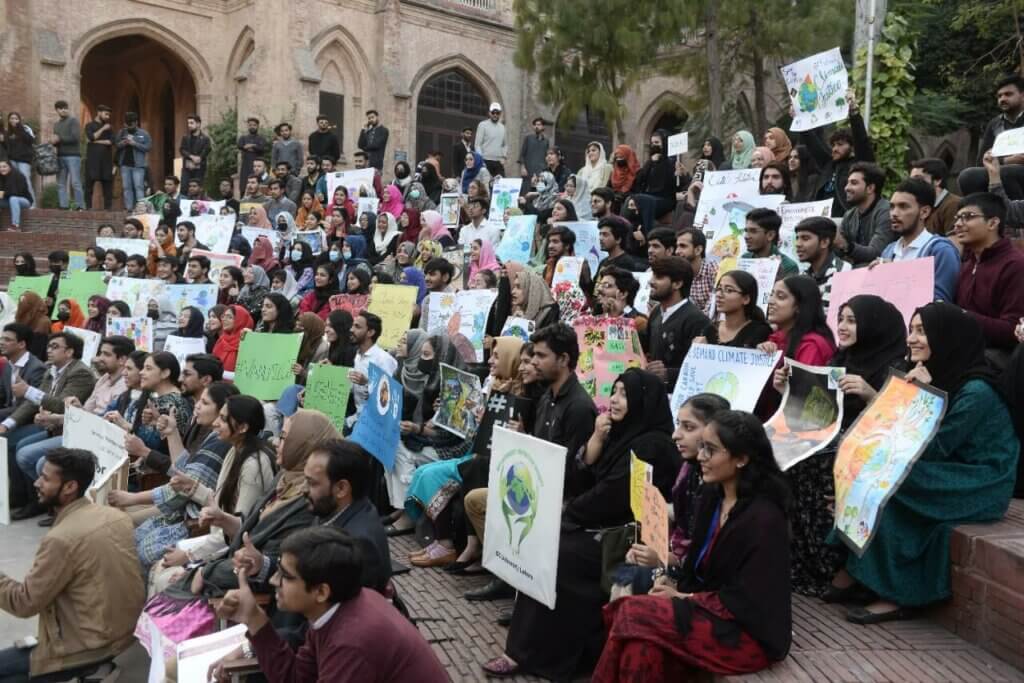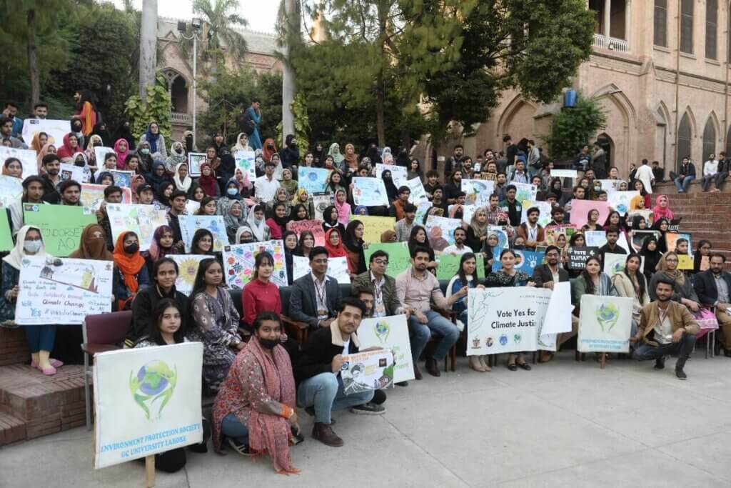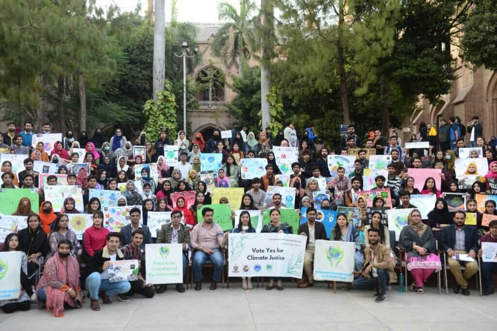 Les étudiants, rejoints par le professeur Asghar Zaidi, vice-chancelier de la GCU de Lahore, et le professeur Habib Ali Bokhari, vice-chancelier de la Kohsar University de Murree, ont également scandé le slogan « Votez OUI pour la justice climatique ».